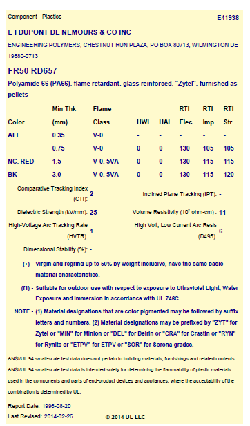 材料标识 : PA66-GF25%-V0,颜色 : 黑色/Black,UL编号 : E41938,厂商品牌 : Zytel ,用途 : 电线电缆,材料特性 : 填充物为25% 玻璃纤维增强材料.阻燃,材料形状 : 颗粒状/Resin,加工方式 : 注射成型/Injection molding, (更多..)