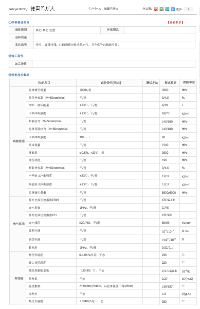 材料标识 : PA66,颜色 : 本色/Natural colour,厂商品牌 : TECHNYL ,用途 : 电气/电子应用,材料特性 : 快速成型周期,成核,加工性能良好,材料形状 : 颗粒状/Resin,加工方式 : 注射成型/Injection molding, (更多..)