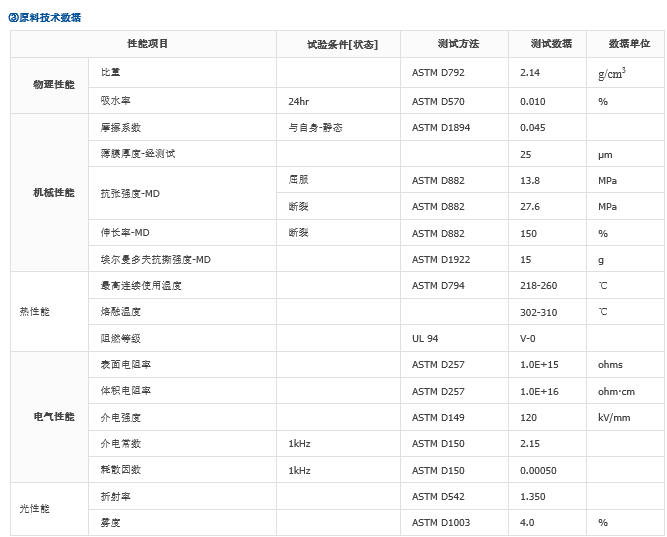 重要参数: 密度:2.14 g/cm3 吸水率:0.03 % 弯曲模量:689 MPa 硬度:60 热变形温度:47.8 ℃ 脆化温度:-196 ℃