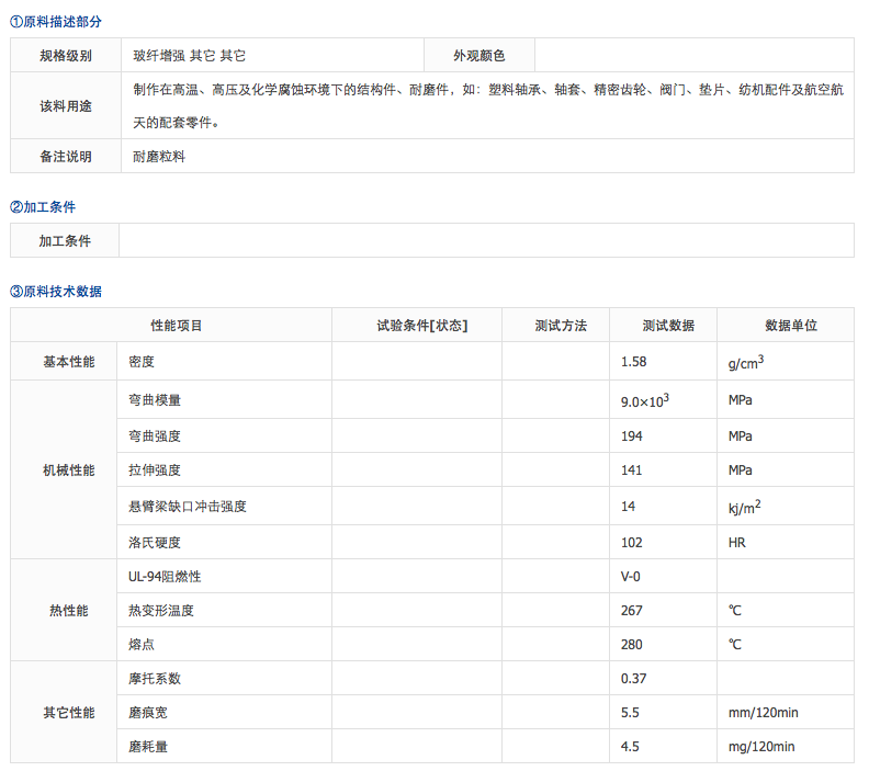 拉伸强度 : 115MPa,密度 : 1.95g/cm3,吸水率 : 0.02%,规格级别 : 增强,缺口冲击强度 : 6,成型收缩率 : 0.4%,特性级别 : 热稳定性,增强级,阻燃级,